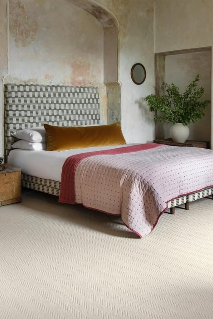 Instead, you want it to calm everything down. A subtle, textured rug like this gives you a soft landing without pulling focus away from the bed or architectural details.