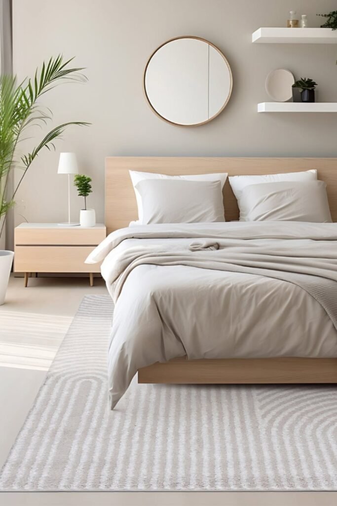 A slightly patterned rug creates a clear frame around your bed, so the room feels finished instead of flat.