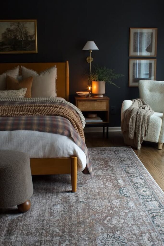 When your bedroom mixes light walls with darker furniture, the rug becomes the piece that quietly pulls everything together for you.