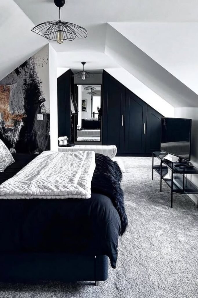 You can make angled ceilings feel dramatic with your black wardrobes against crisp white walls.