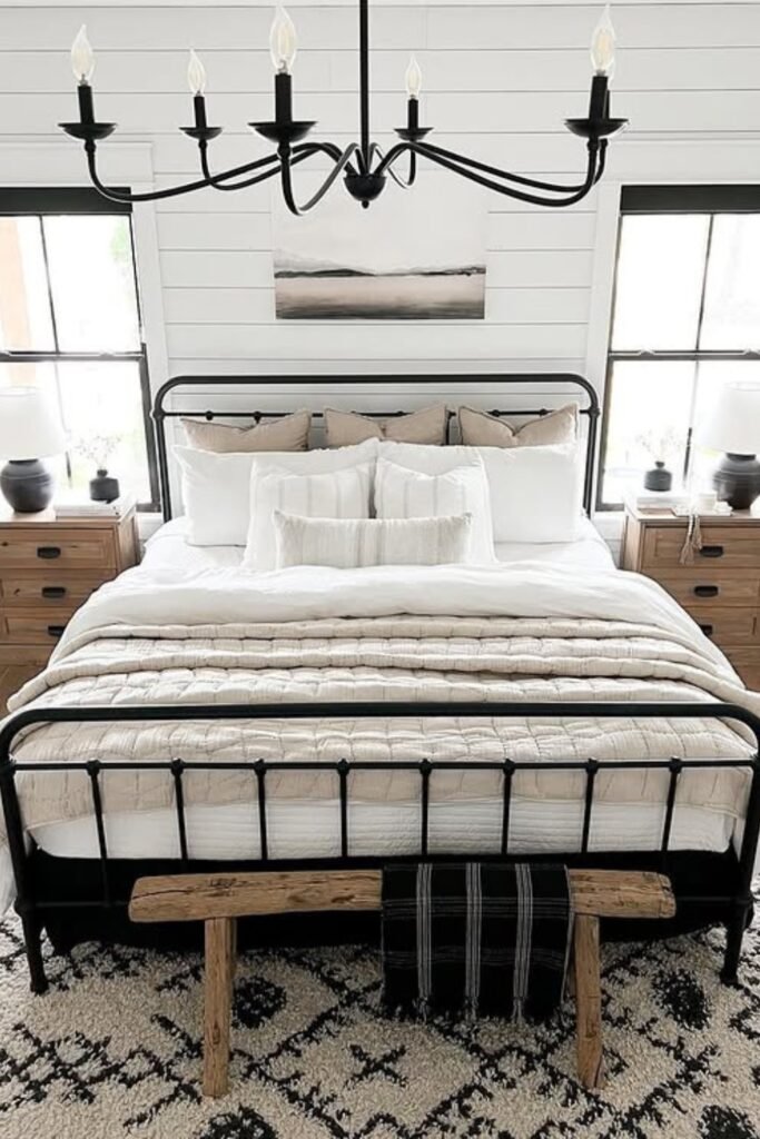 You will see the white shiplap walls and black window frames give your bedroom a clean, timeless base, while warm wood tones bring it down to earth.