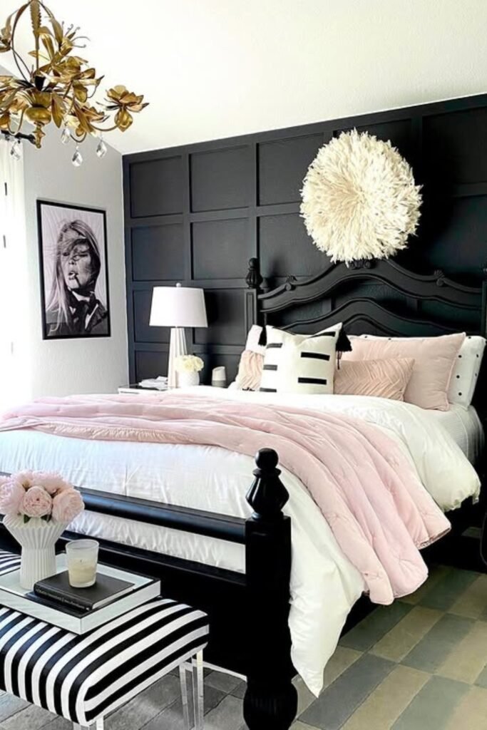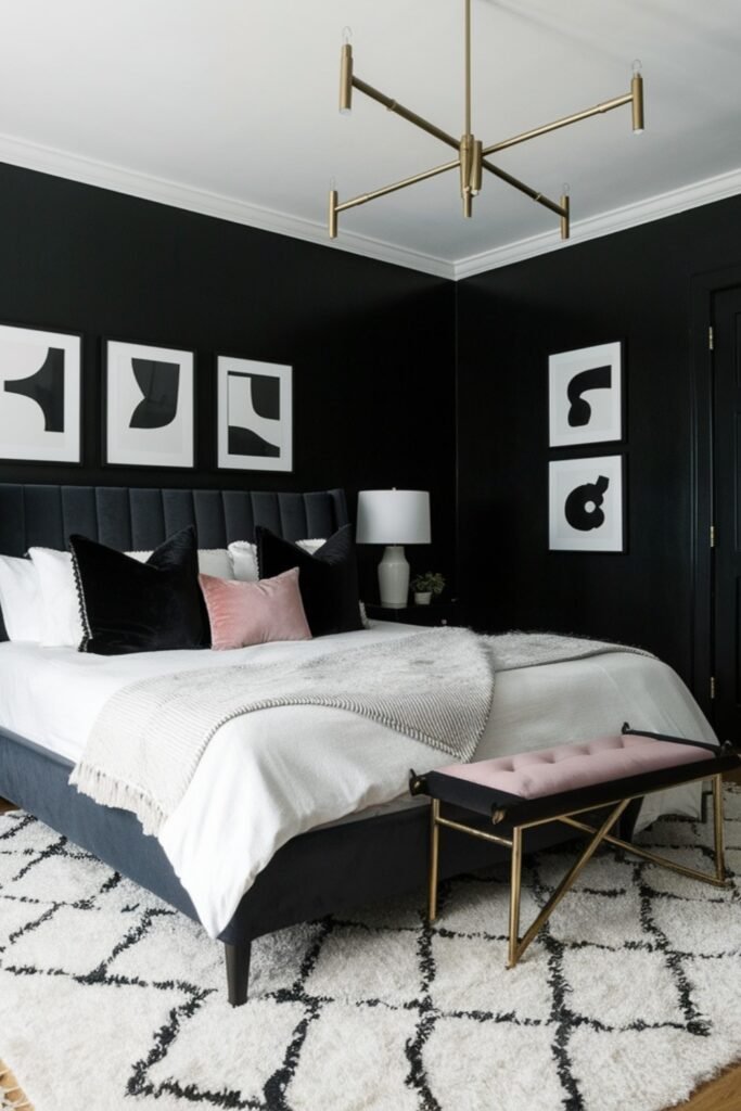 You can create instant drama with deep black walls, but balance is key. White ceilings, rugs, and lamps pull light back into your room, while a blush bench or pillow adds warmth.