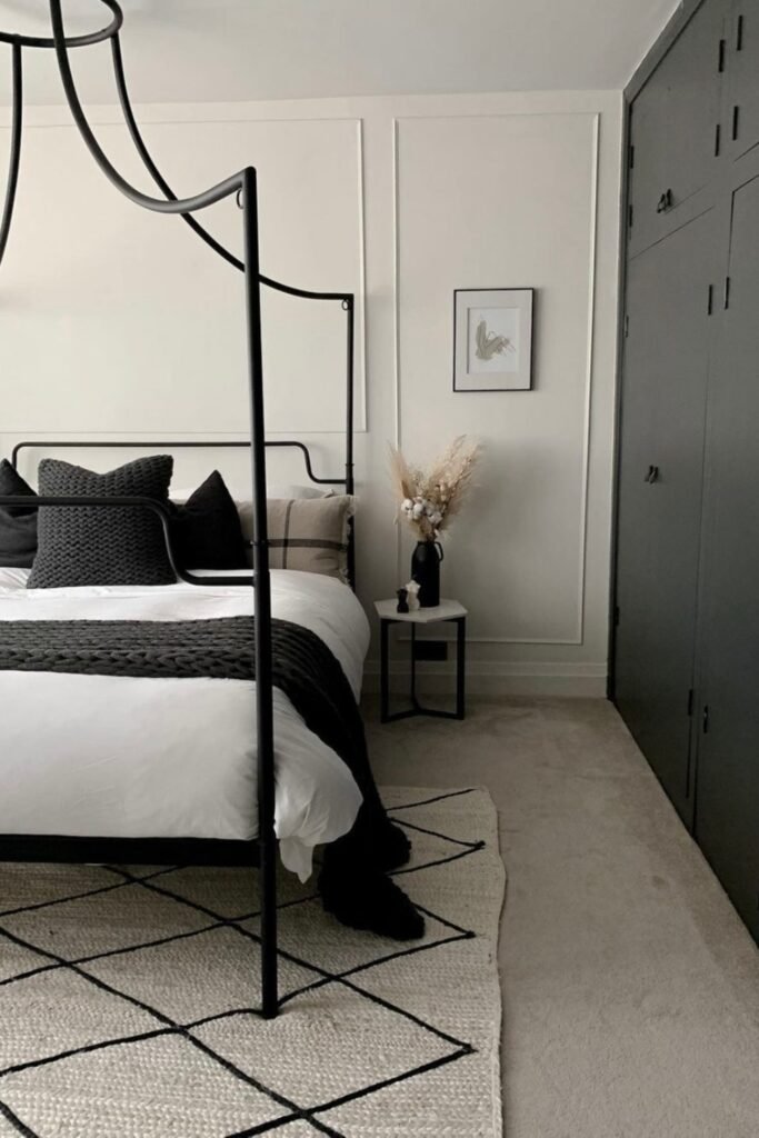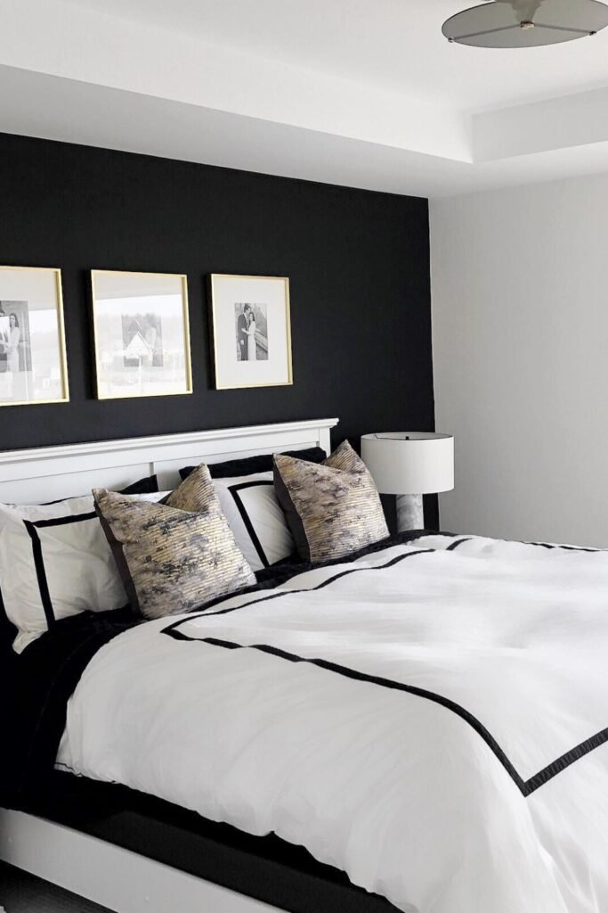 You need to find the balance. Start with white walls so you give yourself an open, airy base. Then, you bring in black through your bedding, lamps, or artwork to add contrast.