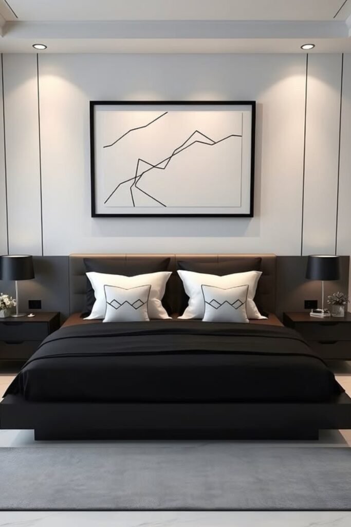 A dark bed and lamps anchor your space, while geometric wall art ties everything together quietly but precisely.
