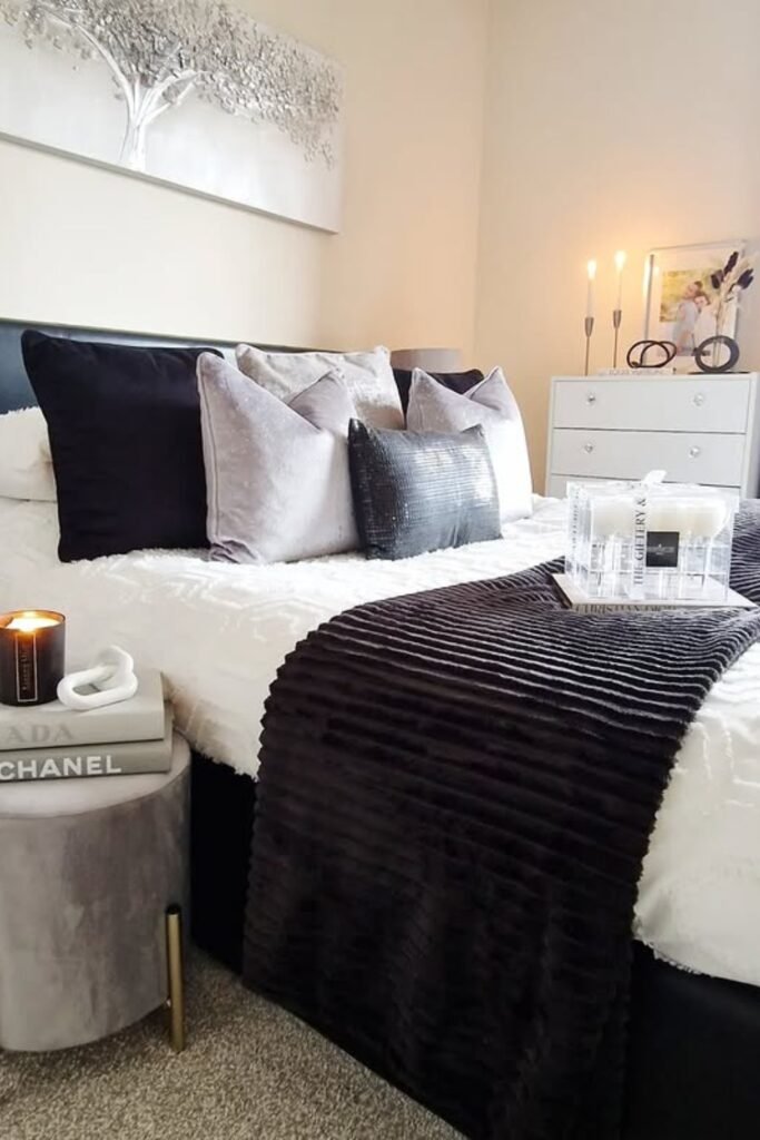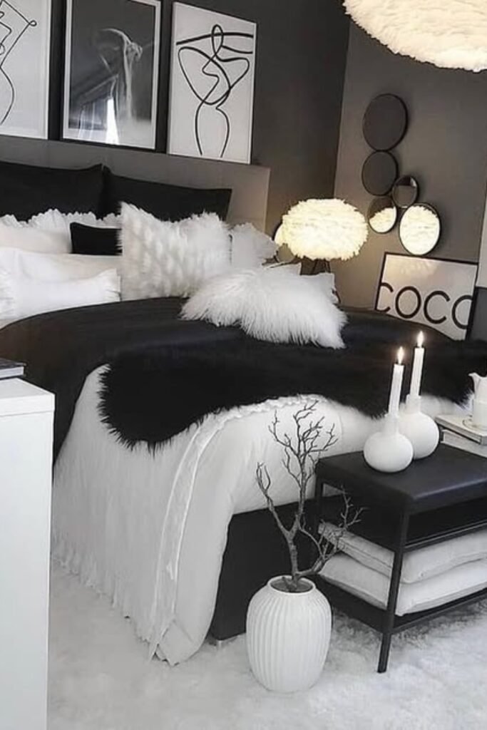 You will love the soft fur, candlelight, and layered pillows transform a black-and-white bedroom into your snug retreat.