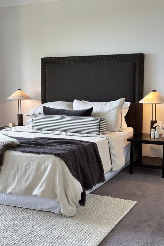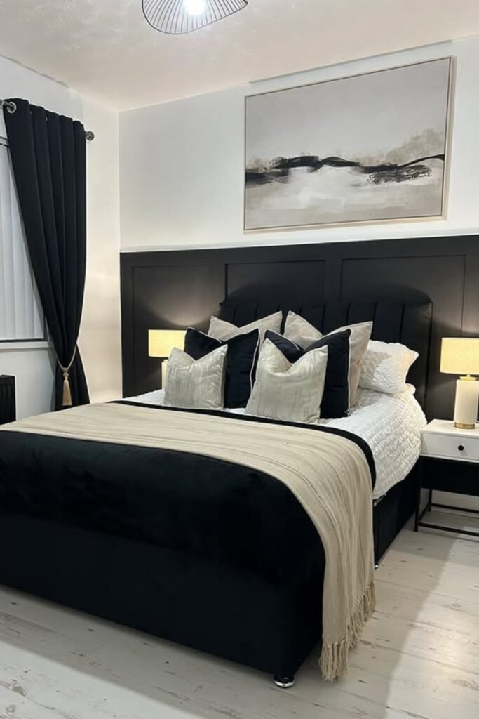 The tufted black headboard and paneled wall give depth, while light bedding and a cozy throw keep your space from feeling heavy.
