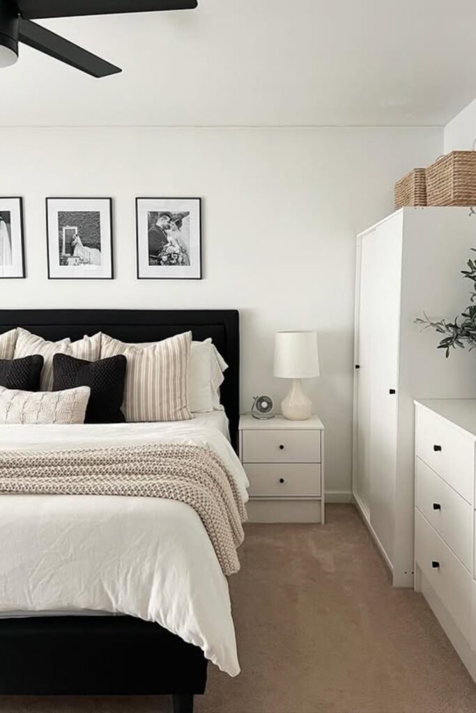 You can even bring in small touches like warm lighting, beige-toned throws, or textured pillows to make your monochrome bedroom feel relaxed, inviting, and full of character.