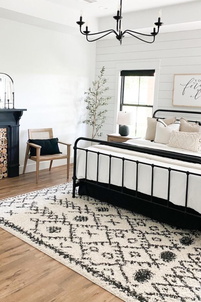The black iron bed keeps everything grounded, and a patterned rug softens your feet as you move around.