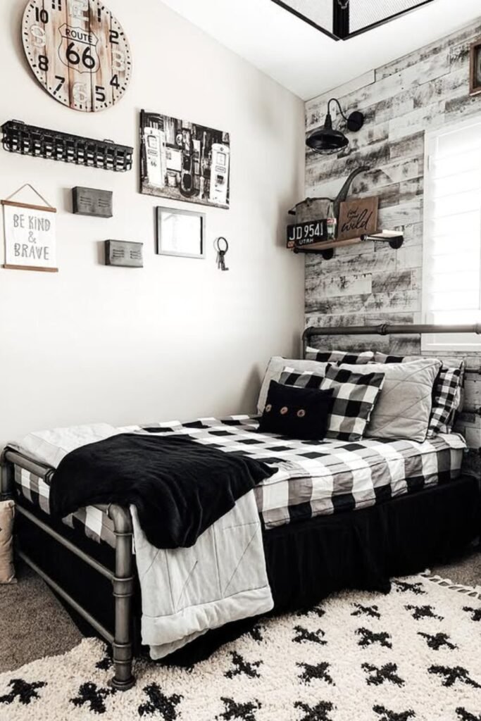 You can instantly energize a small bedroom with black-and-white checks while letting industrial pipes and weathered wood walls feel grounded.