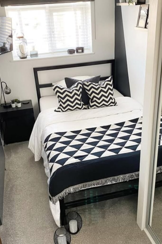 This layout is perfect for narrow or apartment bedrooms, stick to bold black-and-white patterns, sleek furniture, and reflective surfaces to visually expand your space.