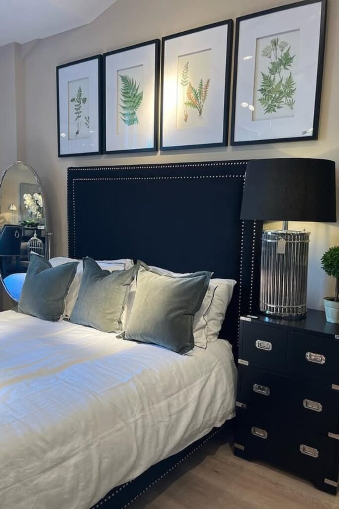 You will notice a single black accent wall makes a white bed frame pop, while gold-trimmed frames add just enough warmth to keep your room from feeling stark.