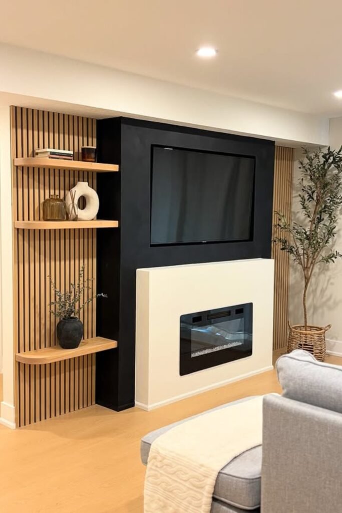 When you frame your TV with a black panel, you’ll instantly define your living room zone, while vertical wood slats on both sides keep it warm and textured.