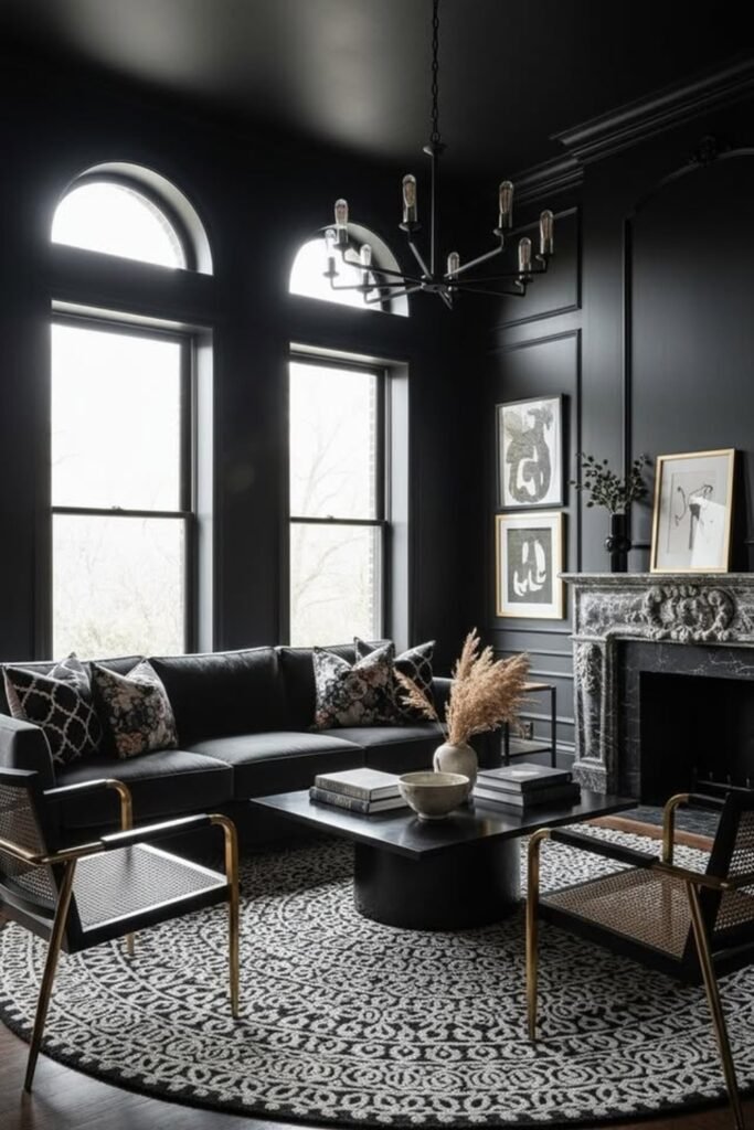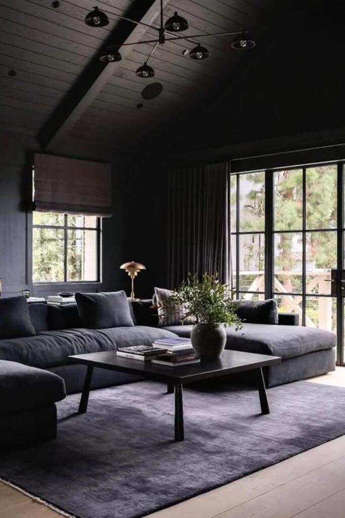 This look suits high-ceiling spaces with large windows. You can add warm wood flooring or brass accents so the darkness feels rich and intentional, not like you just painted everything black.