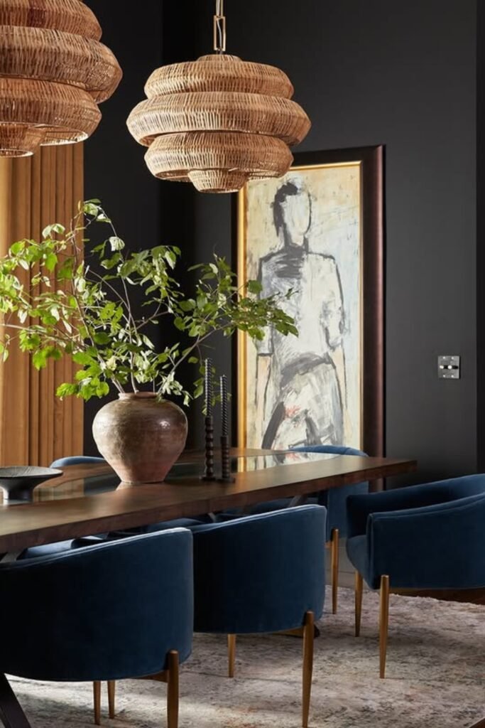 You can place a solid wood table to instantly warm your space and keep the room grounded. Add woven lighting or natural textures overhead so you soften the darkness even more.