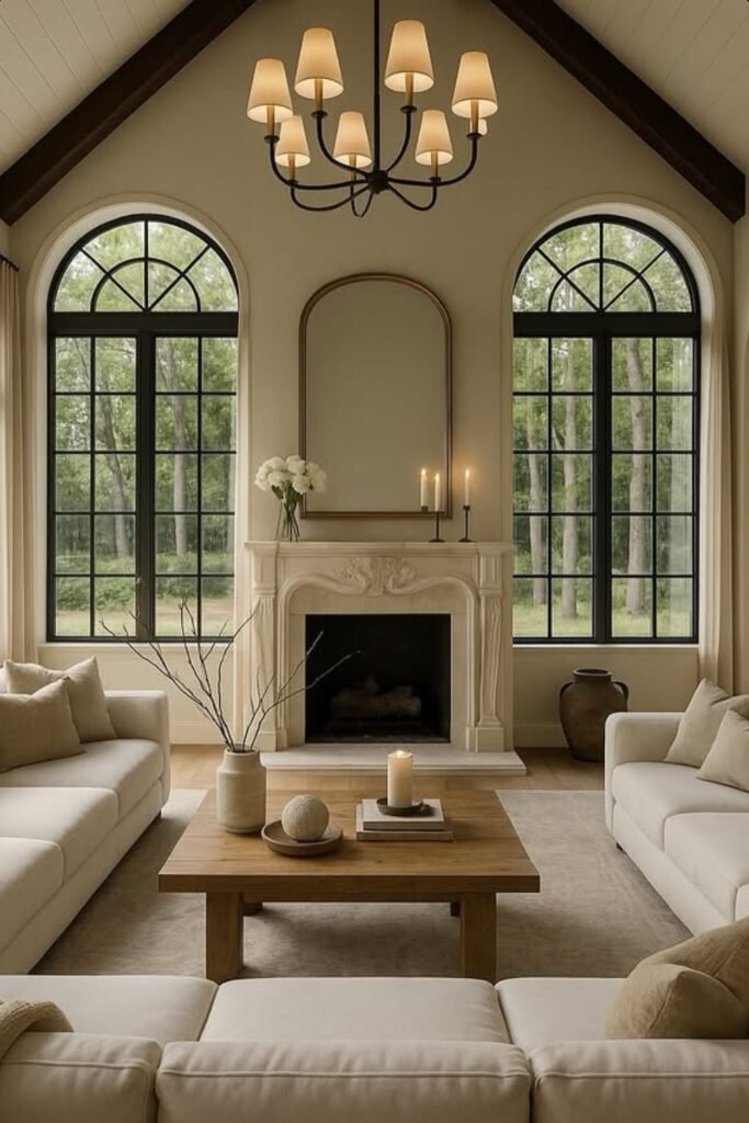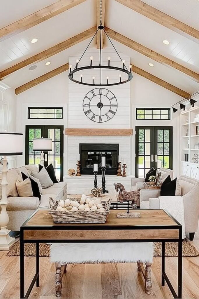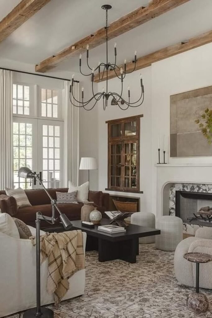 That chunky black coffee table will anchor your seating area without fighting the rustic details. Keep your sofas light so the space doesn’t feel heavy.
