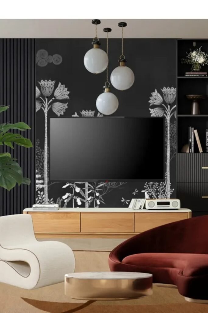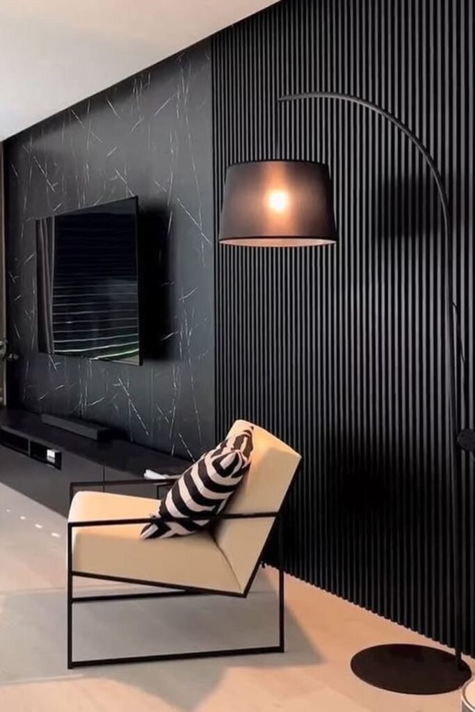 Flat black can feel dull, but you can change everything with texture. You’ll notice vertical slats and subtle veining behind your TV add depth without adding clutter.