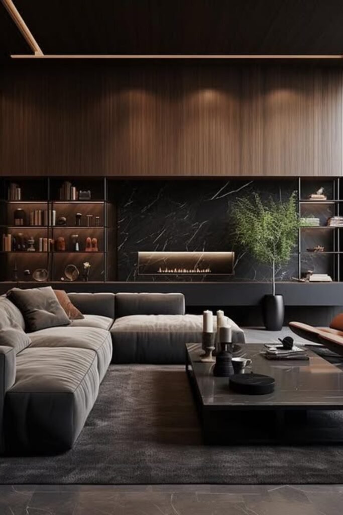 The key is layering you should add warm lighting inside shelves and mix matte black with natural textures.