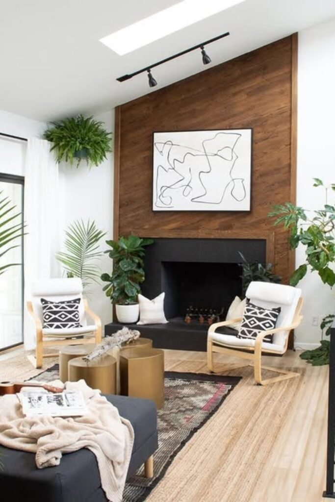 A dark fireplace insert can instantly anchor your corner, while a vertical wood panel above adds warmth and height.