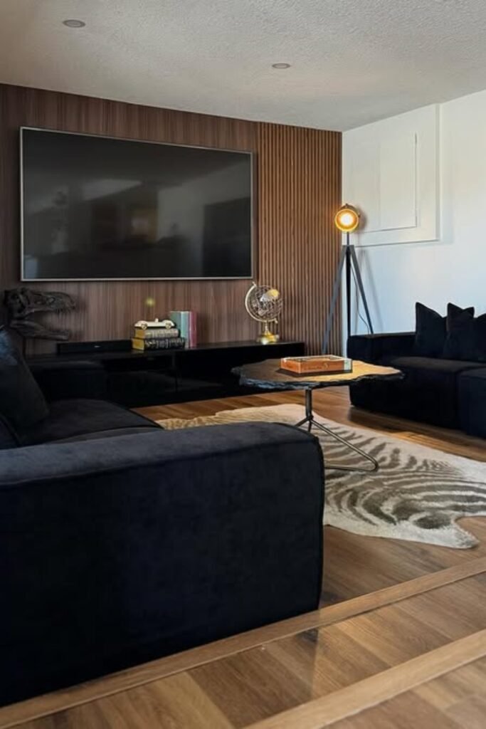 A vertical wood slat wall behind your TV will instantly soften the bold furniture and make your living room feel intentional. Keep your media console black so it blends in instead of competing.