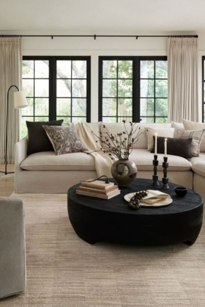 You don’t have to let contrast feel sharp. Your low black round coffee table will ground your living room while your cream sofa keeps everything soft.