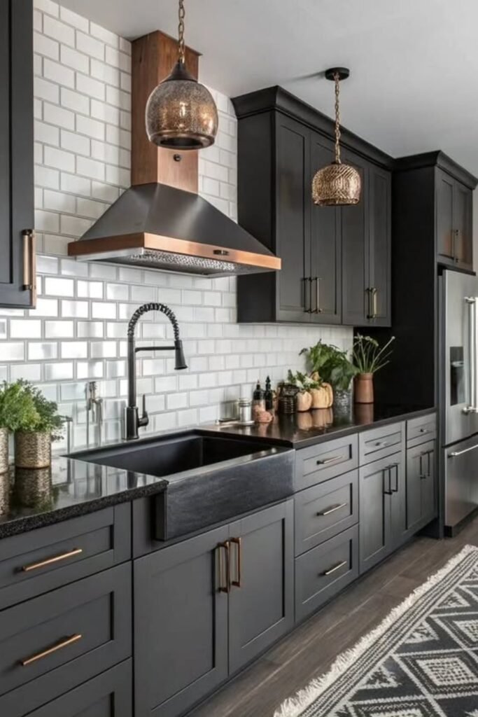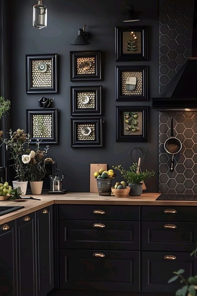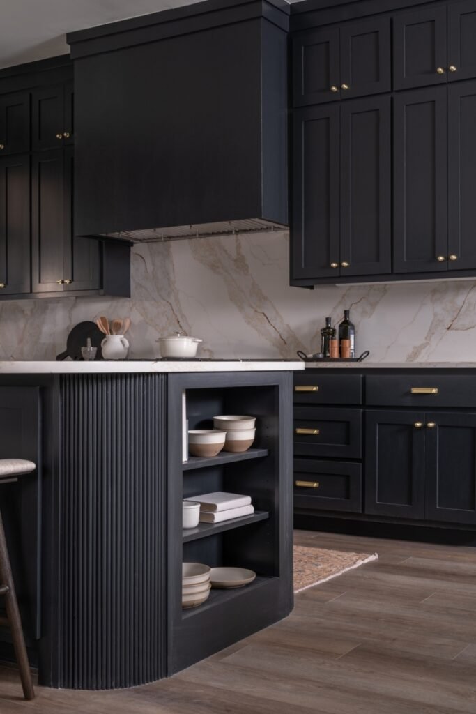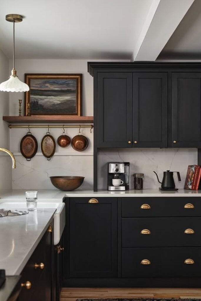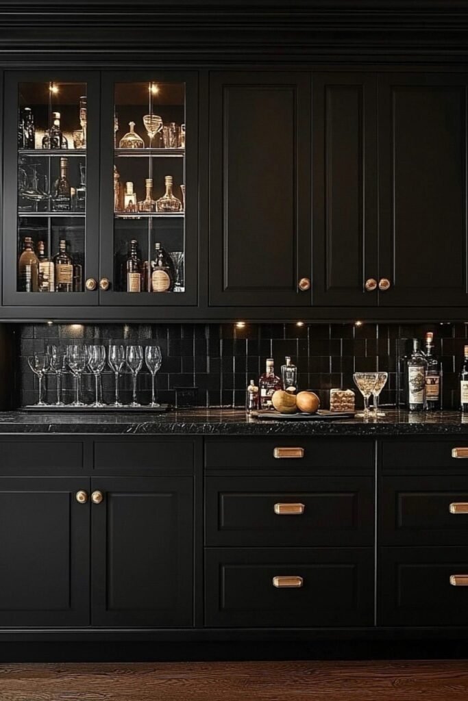 When you pair your black cabinets with white or soft-gray countertops, warm wood accents, and brass or matte-black hardware, your space instantly feels inviting instead of harsh.