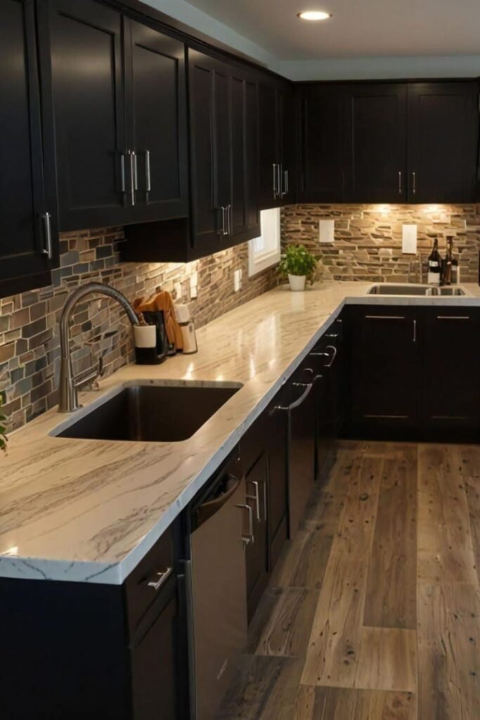 If you love clean lines and timeless style, this one’s for you. You can combine deep black cabinets with soft white marble for a perfectly balanced monochrome look.