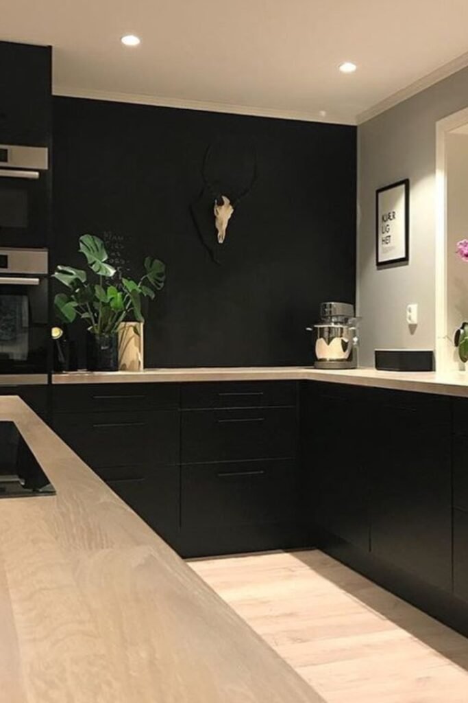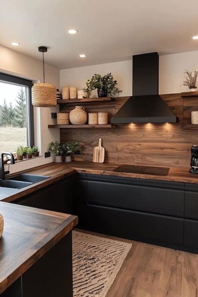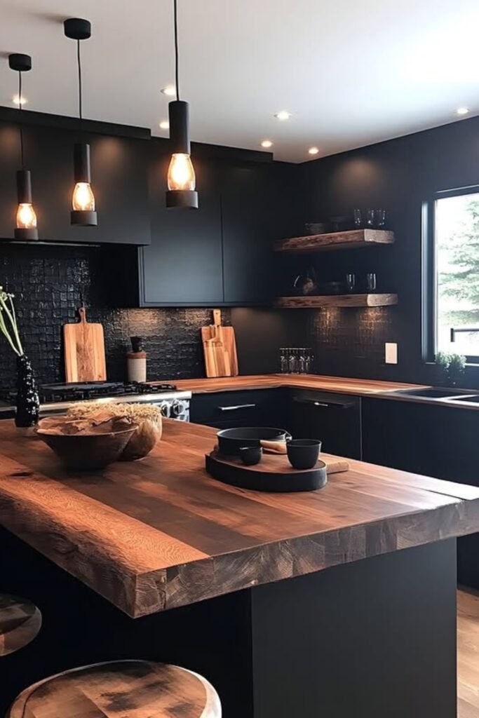 You can pair smooth black cabinets with rustic wood tones for that cozy, organic balance.