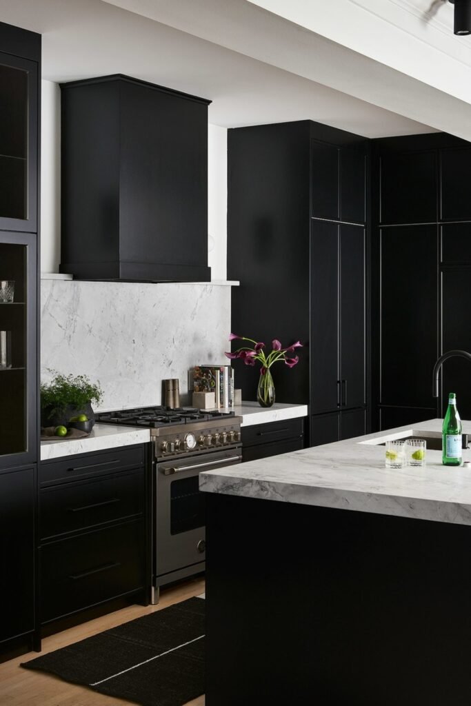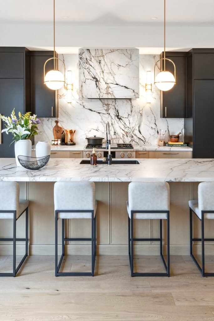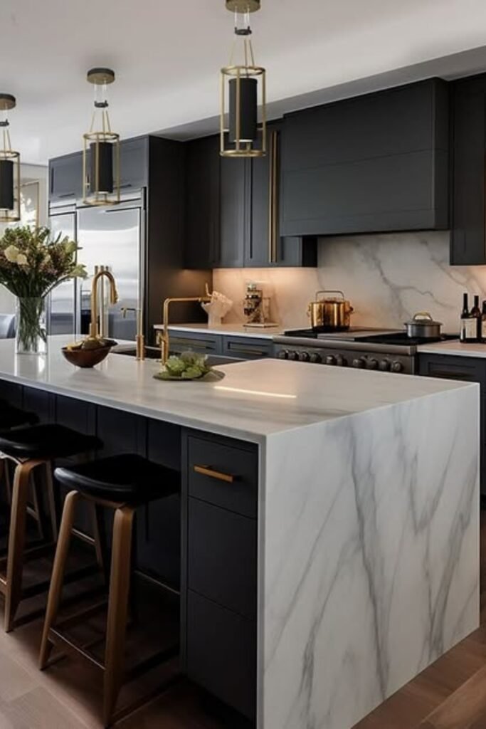 You want a kitchen that feels bold yet open? Pair your black cabinets with bright marble.
