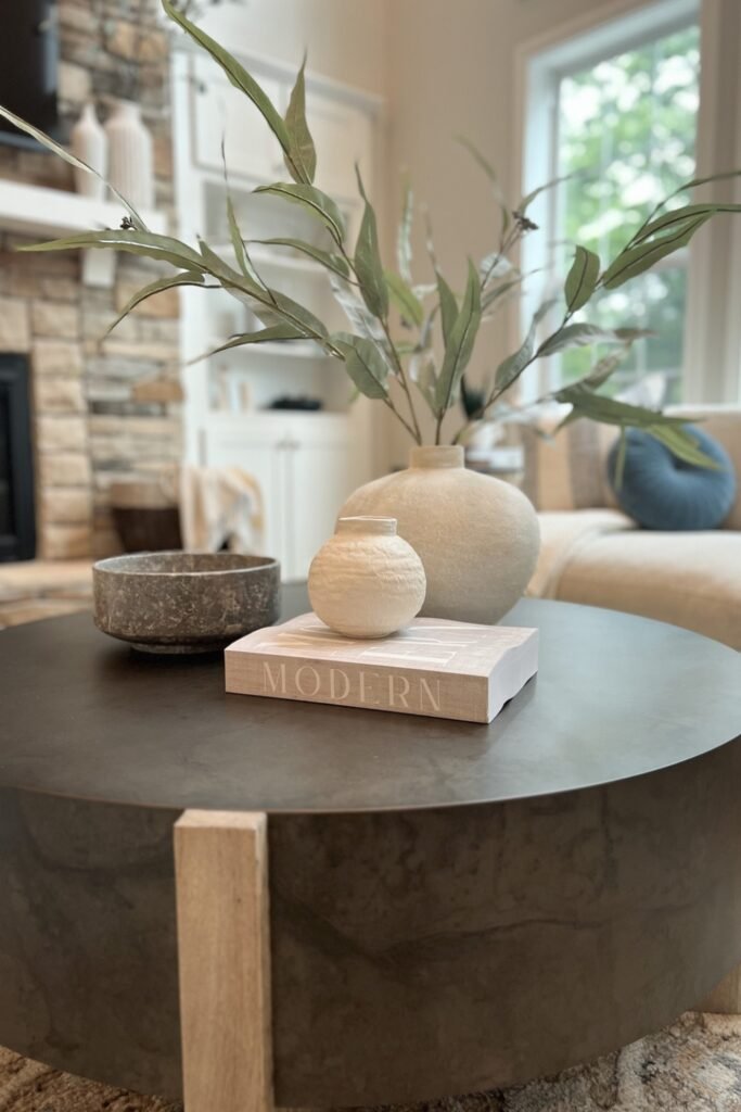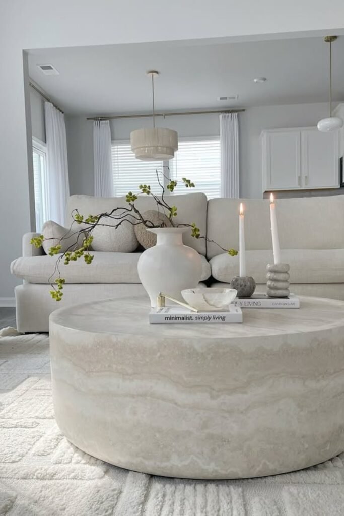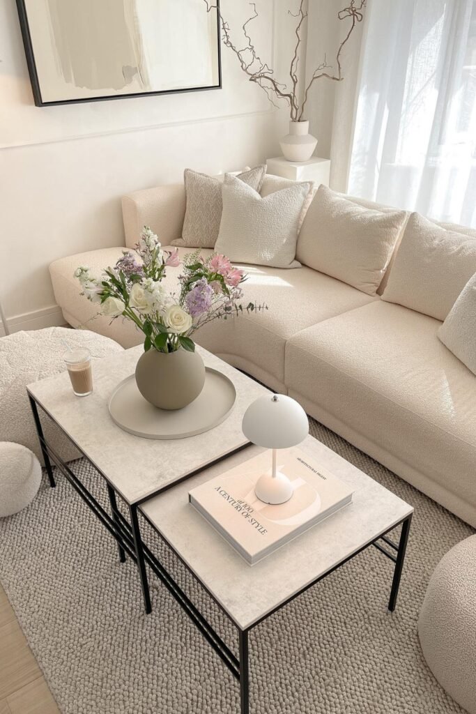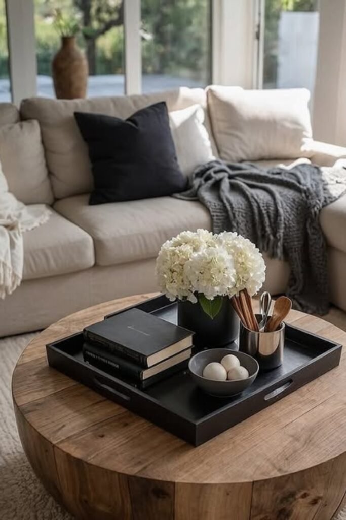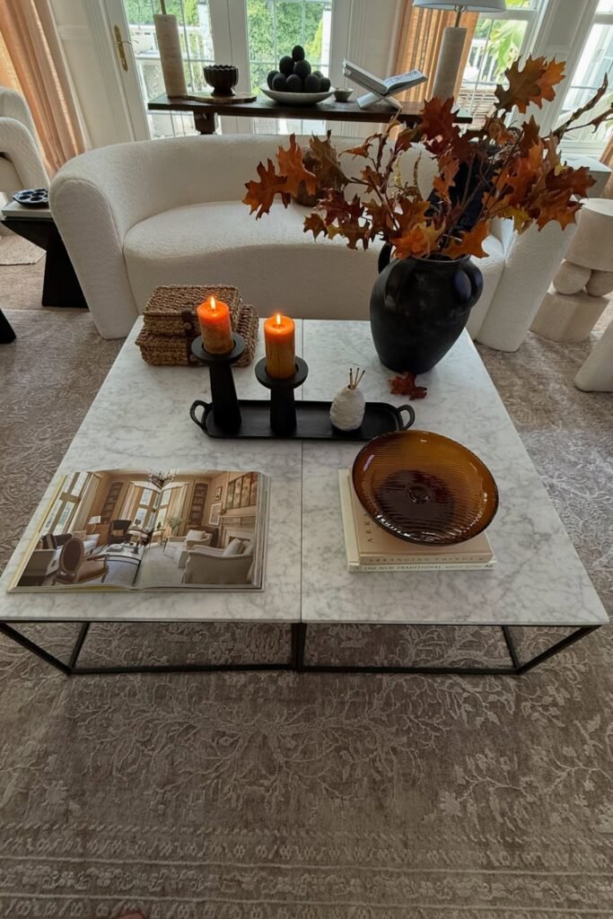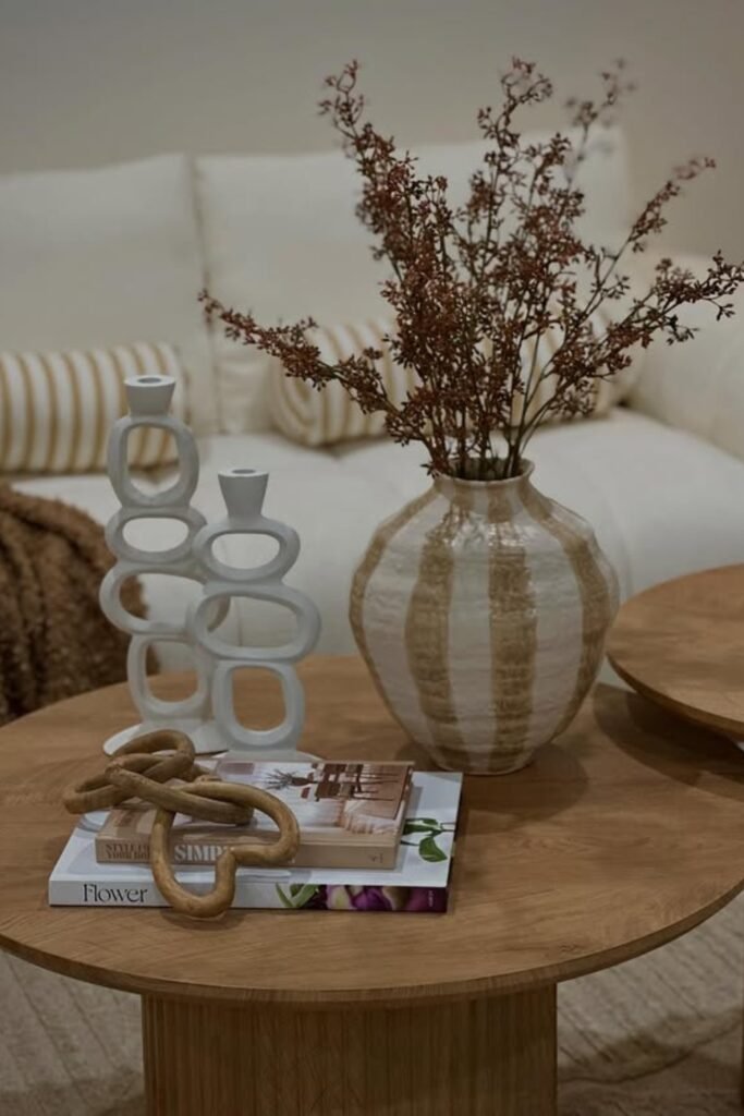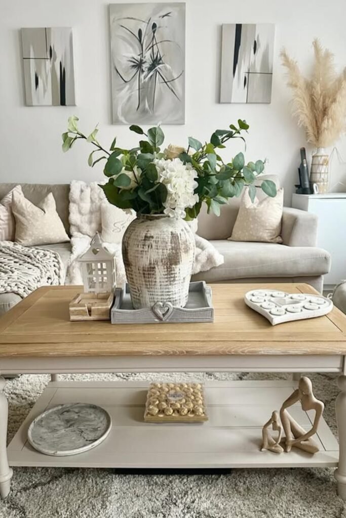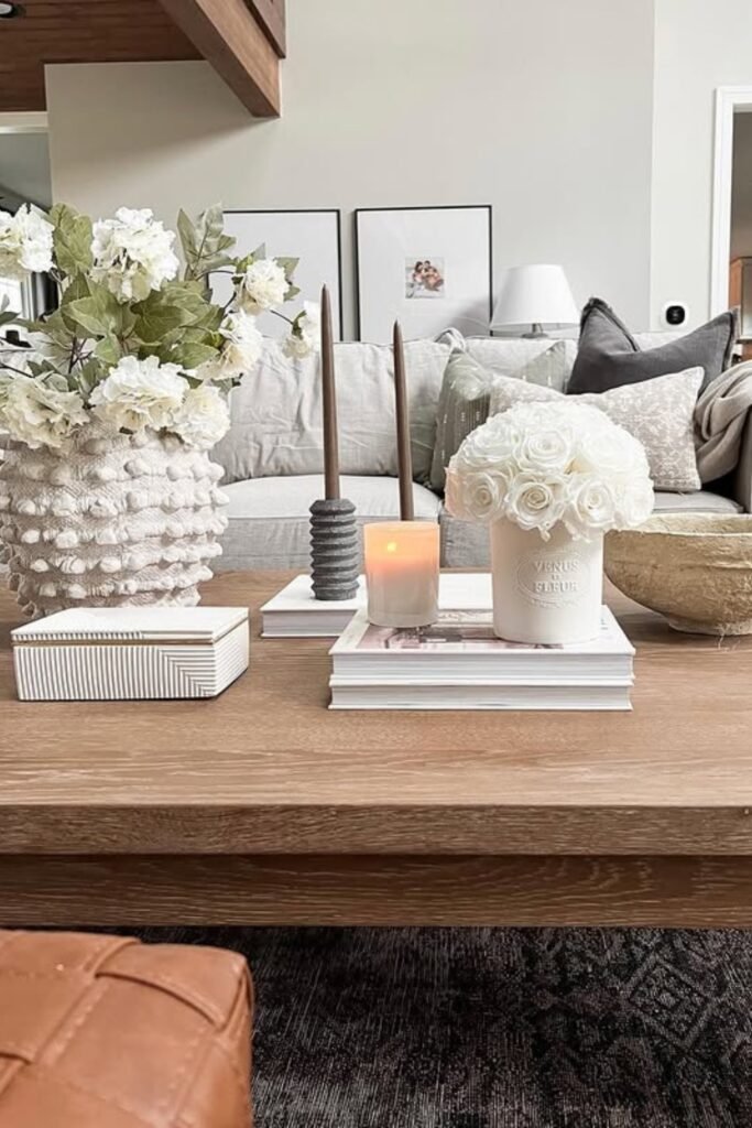 If your living room already feels soft and lived-in, this style is ideal. You can let the coffee table feel calm and intentional without trying to look perfect.