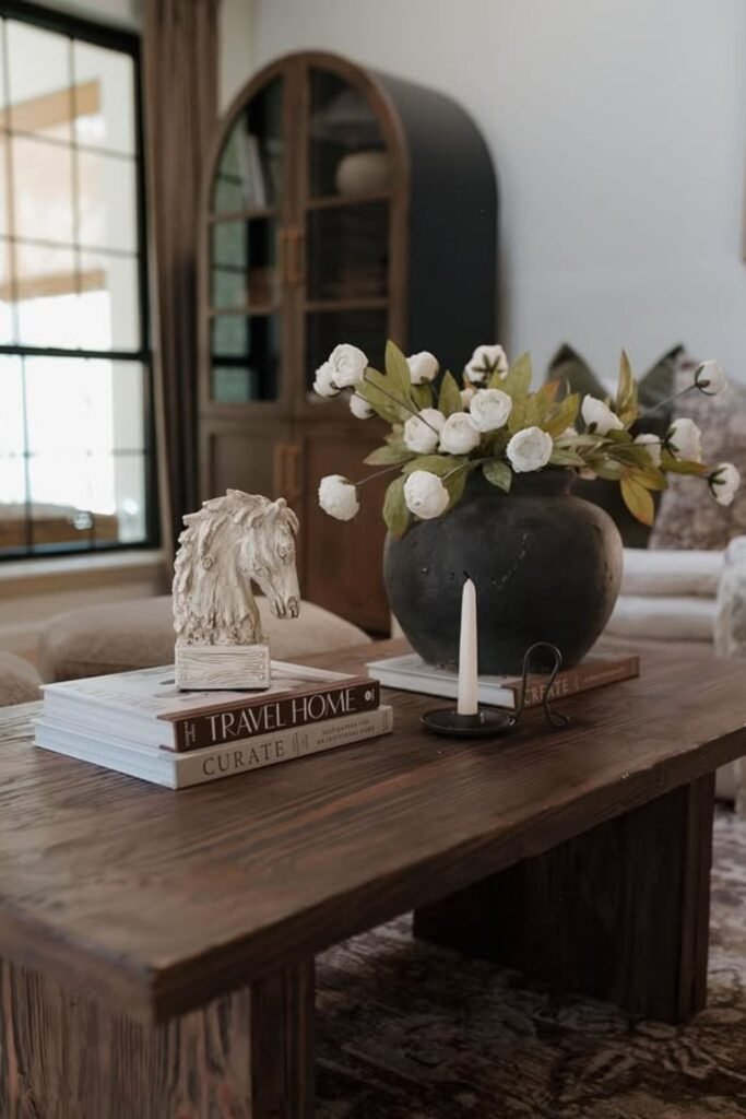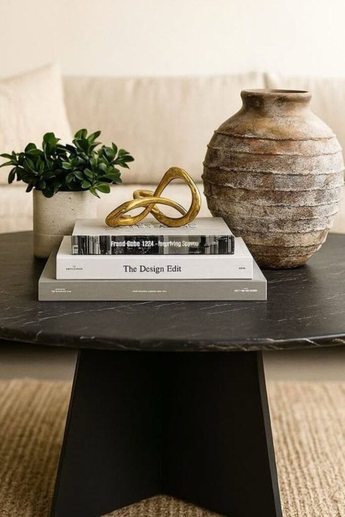 You can let the coffee table carry one strong centerpiece and a few grounded accents, instead of scattering decor everywhere.