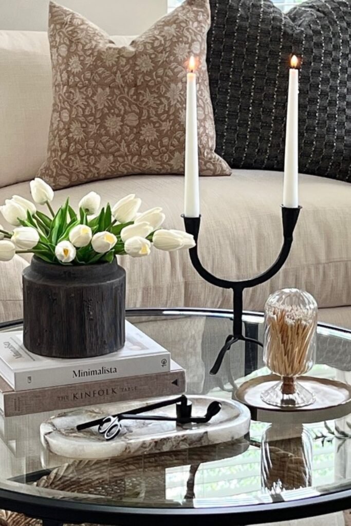 A glass table keeps the space light, so you can layer decor without it feeling heavy. You can stack books first, then add one floral element and one candle for height.