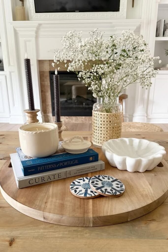 You can finish with one small, useful item like coasters or a box. You can keep some empty space on purpose, that’s what makes your table feel easy to use.