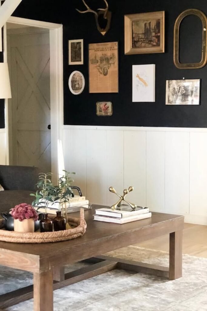 When your living room already has strong personality, the coffee table shouldn’t try to steal attention. You can balance dark walls and layered art with a grounded, simple setup.