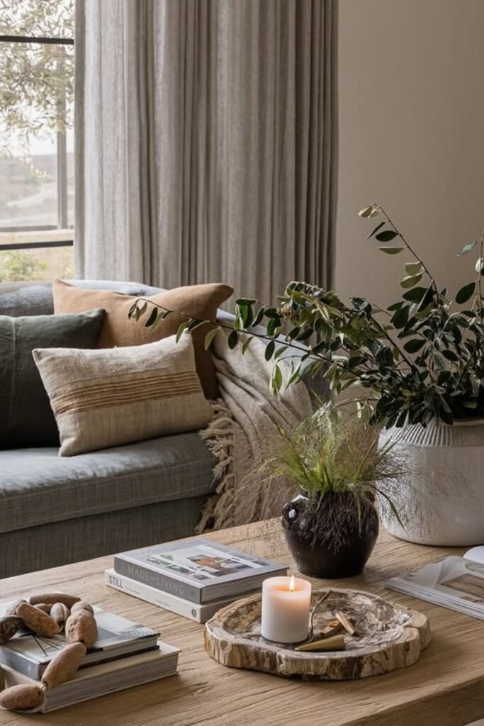 You can mix one natural element, like greenery, with one warm accent, like a candle. You can keep textures rough and organic.