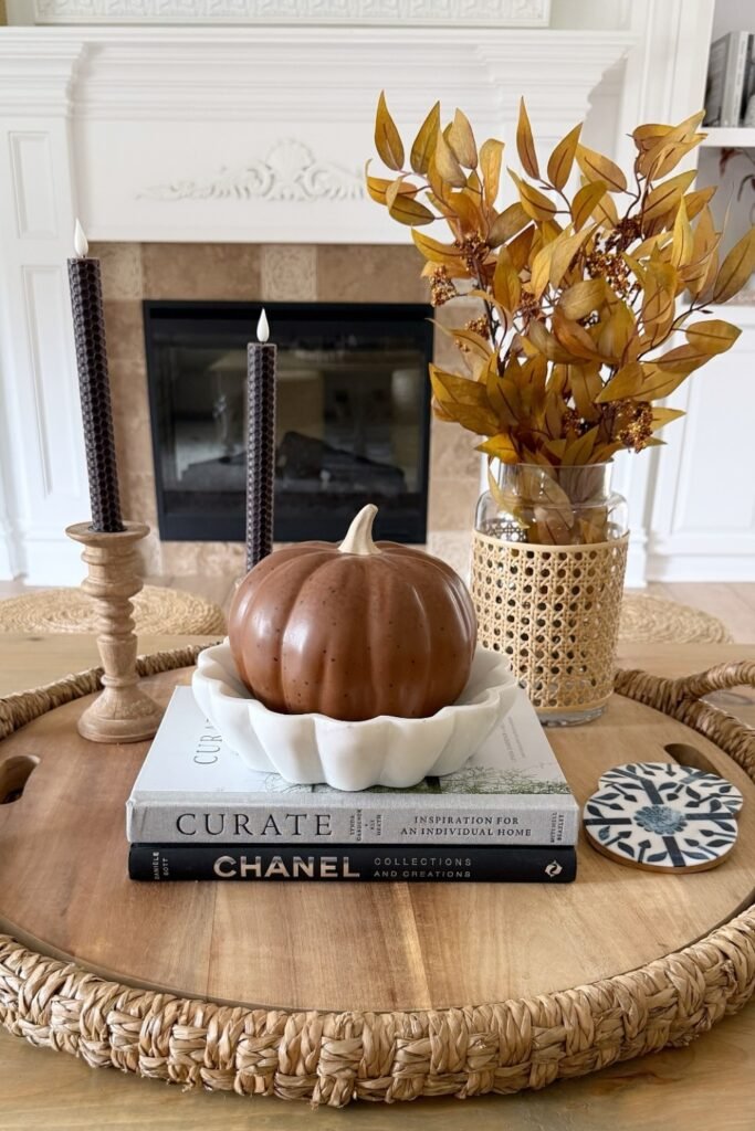 You can layer one seasonal object on books, then balance it with height from candles or stems.