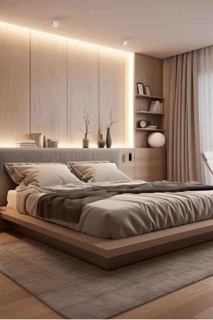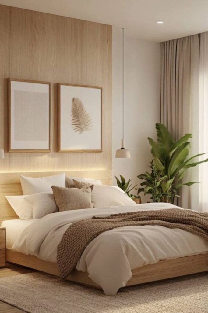 When you add light wood panels behind the bed, you introduce warmth without making the room darker.
