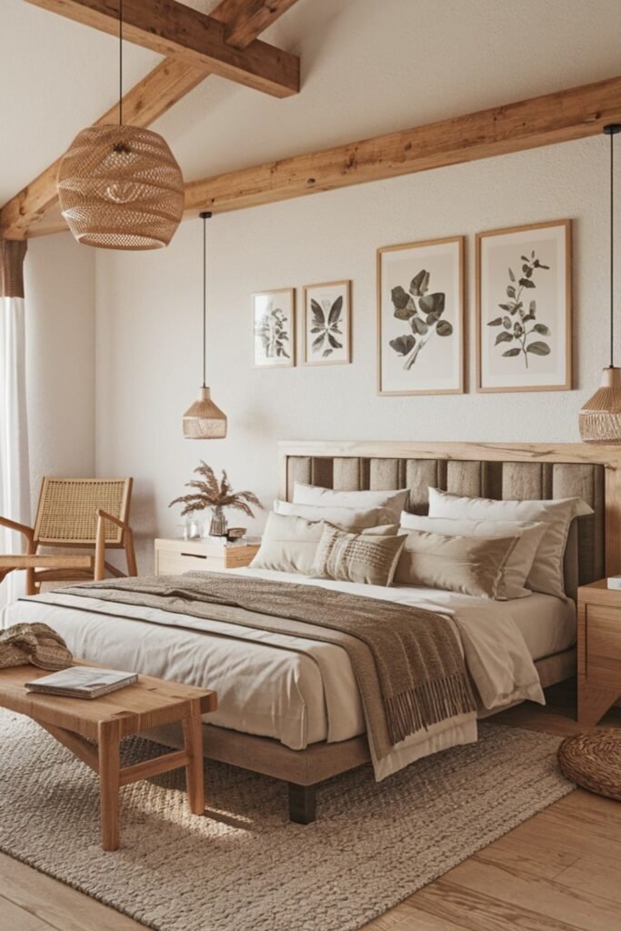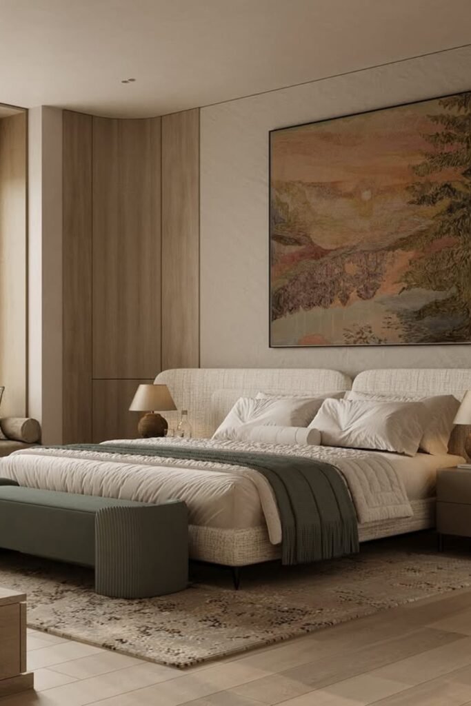 You should keep the palette warm and neutral so the lines stay subtle rather than dramatic. When you use a low upholstered bed, you keep the entire space feeling grounded.