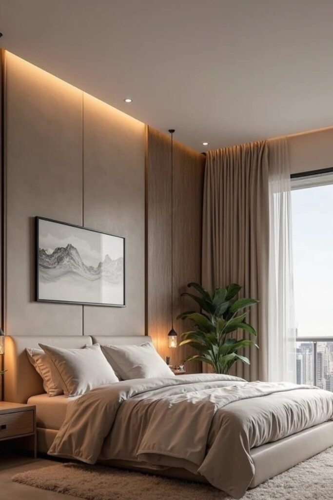 You can layer hidden ceiling lighting with slim bedside pendants so you create a soft glow instead of harsh overhead light.