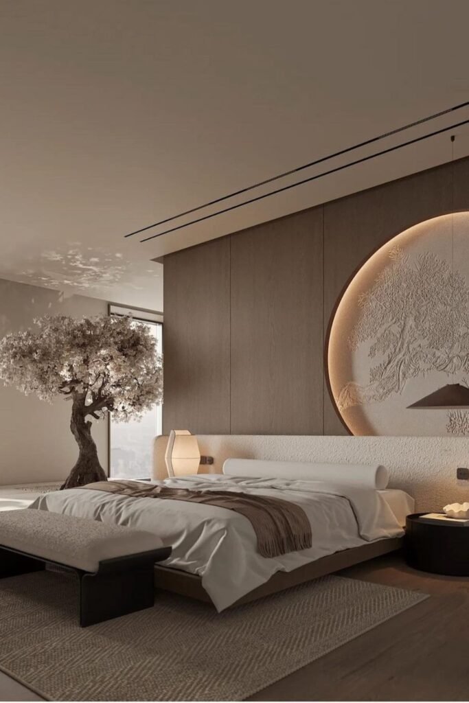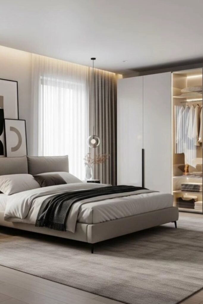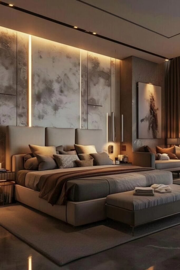 If you have a spacious bedroom, you can layer lighting, art, and even a small seating corner without making the room feel crowded.