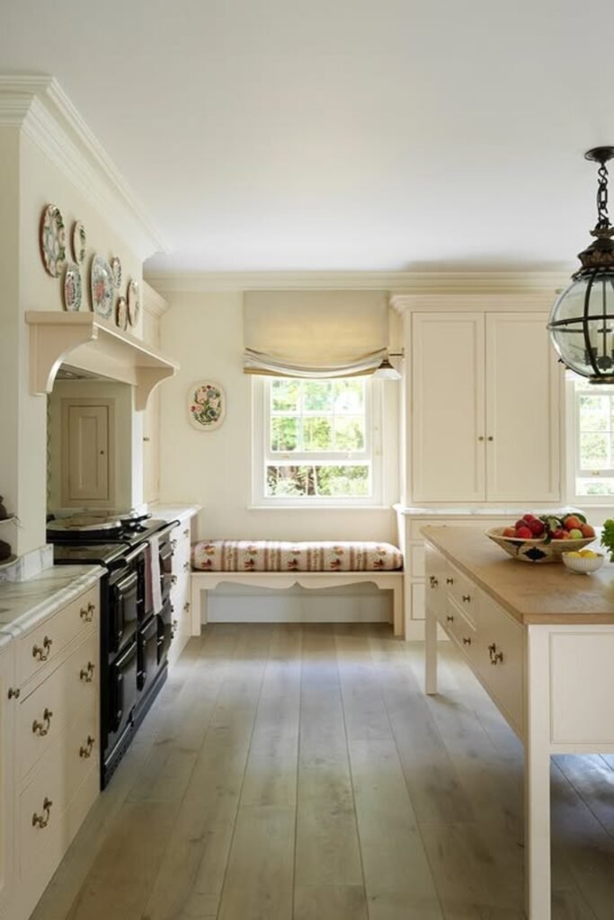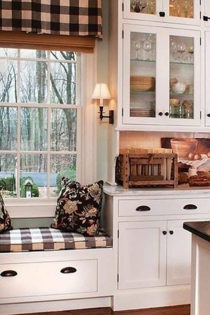 A built-in window seat turns unused space into something warm and personal, which is exactly what a country kitchen needs.