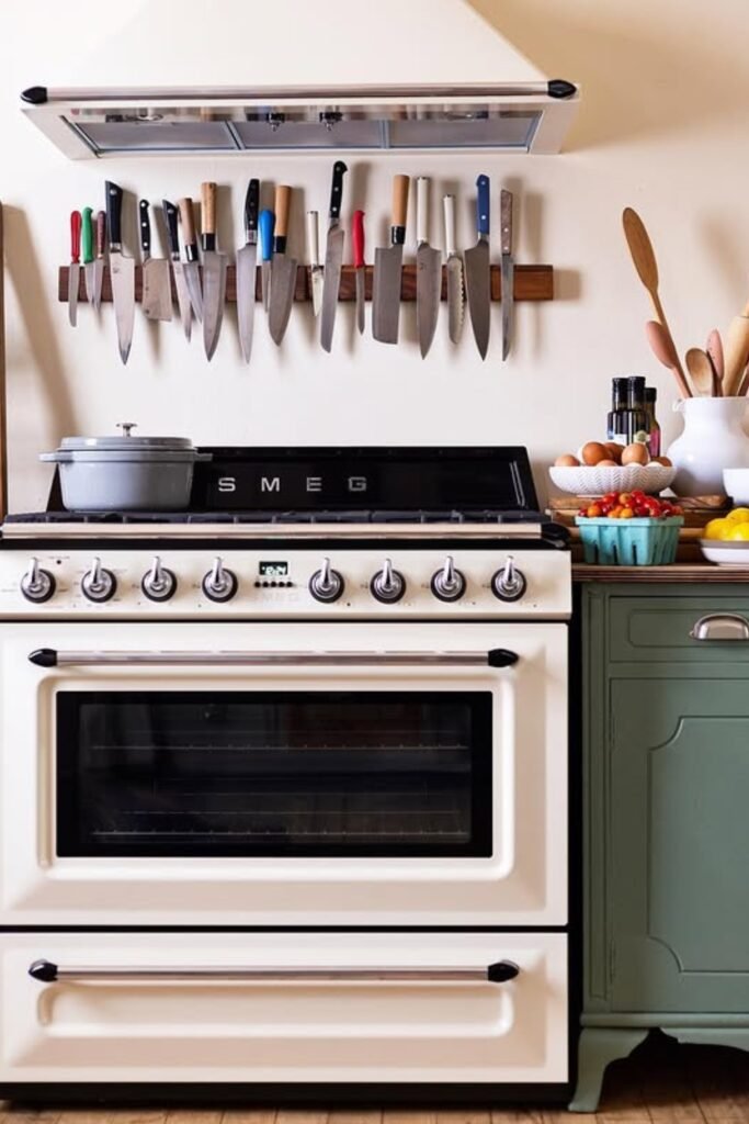 If your kitchen feels too perfect or sterile, bringing tools out in the open adds instant character.