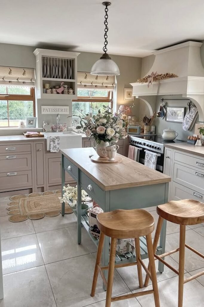 Painted cabinetry, a simple wood island, and classic stools create a calm base, while small touches like fabric blinds, flowers, and open plate storage add warmth.