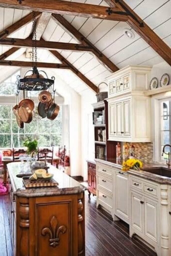 High ceilings, exposed beams, and a long central island give this kitchen a strong country presence that feels open and generous.
