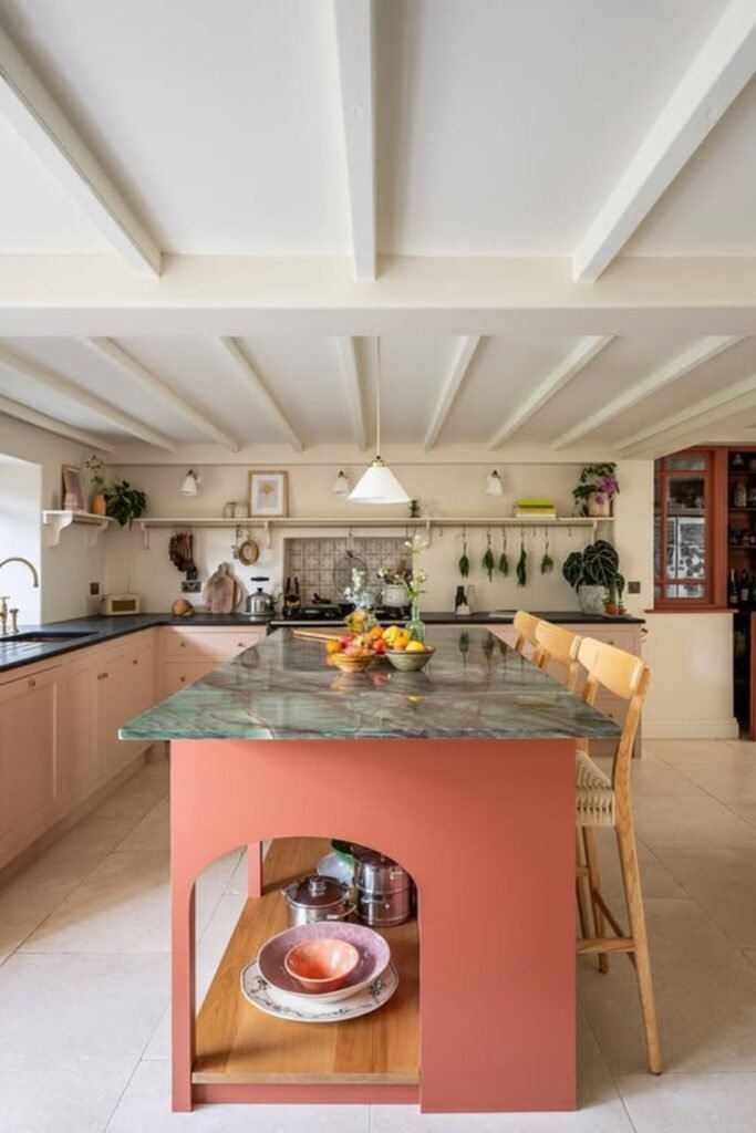 You can pair it with worn stools, mixed cabinetry, and open storage so everything feels practical.
