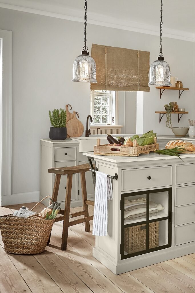 You can use painted cabinetry in a soft neutral, then warm it up with wood stools, woven baskets, and simple pendant lights.