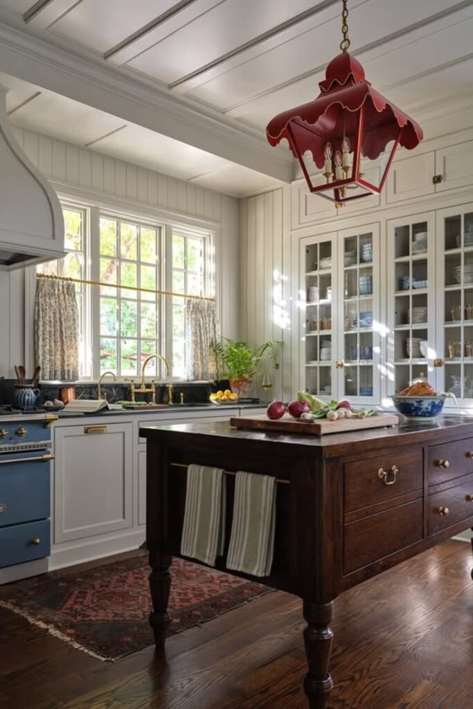 The mix of painted cabinets, a solid wood island, and a statement pendant creates depth without clutter.