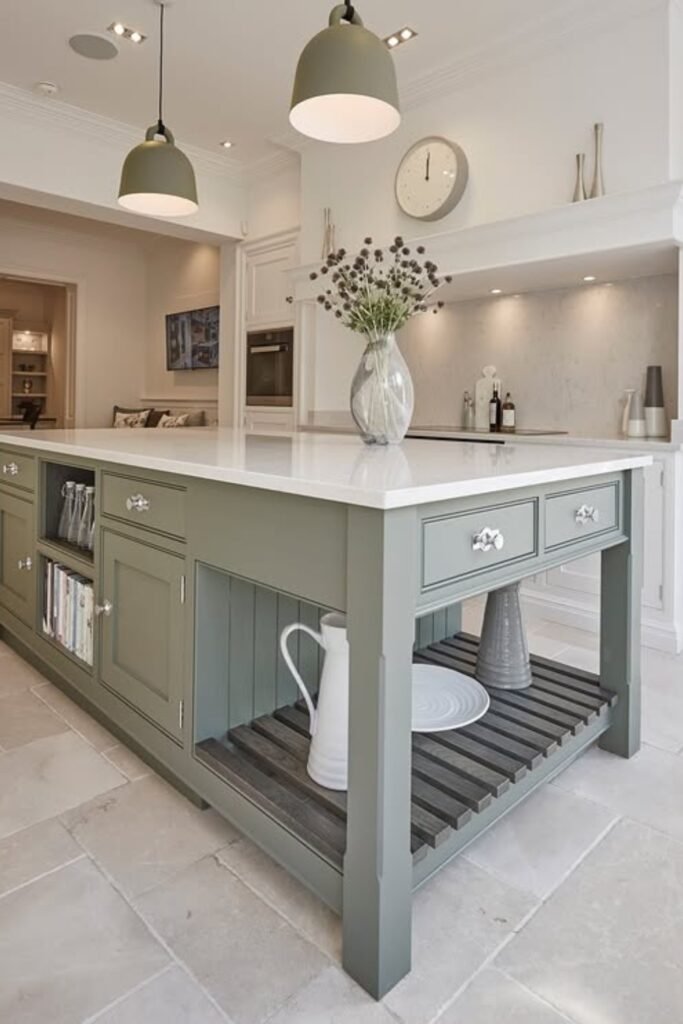 You can keep surrounding cabinets neutral and add open storage underneath so the island feels like a working table, not a decorative piece.