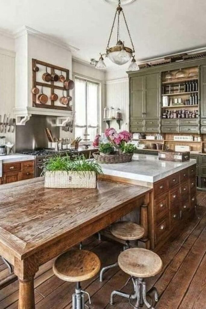 A solid wood worktable like this instantly makes a kitchen feel country because it looks used, not styled.