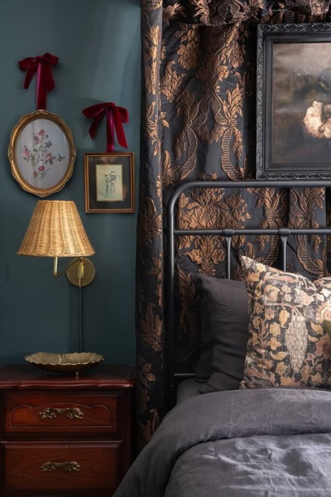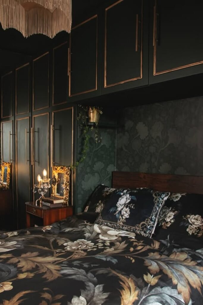 You can pair patterned bedding with solid dark walls and then add gold-framed mirrors or lamps to break up the darkness, giving your room depth without clutter.