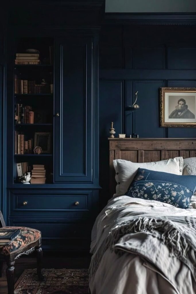 You can create a quiet, studious feel with deep navy walls paired with built-in storage. You will find this ideal if you want your sleeping space to double as a thinking or reading zone.